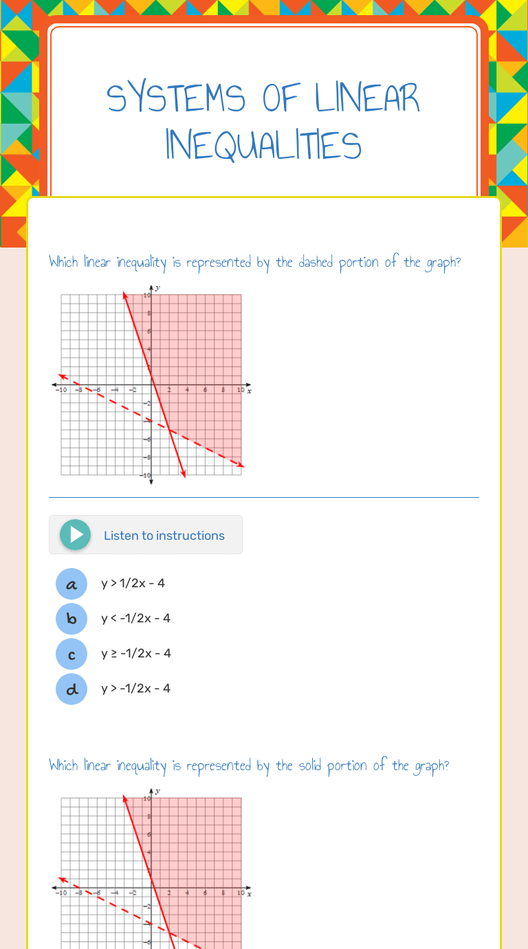 Verifying solutions for linear inequalities. There are 14 problems with an answer key. Watch the video (level 2: Solving & graphing linear inequalities). Write a linear inequality to describe the situation. Determine if the given point is a solution of the given linear inequality. In this algebra worksheet, students graph inequality linear graphs and shade using a test point. Click the buttons to print each worksheet and answer key. Solving inequalities lesson and practice. Examples, solutions, videos, worksheets, and activities to help algebra 1 students learn how to graph inequalities in two variables. Give two combinations of vegetables that sarah can buy. True, then every number in that region is a solution to the inequality. The solution of a linear inequality in two variables like ax + by > c is an ordered pair (x, y) that produces a true statement when the values of x and y .
